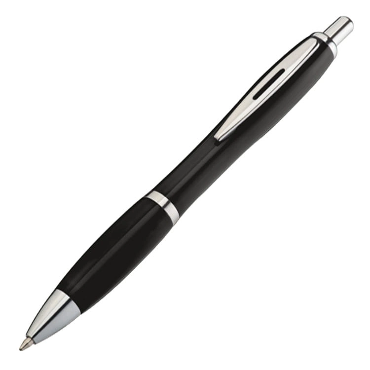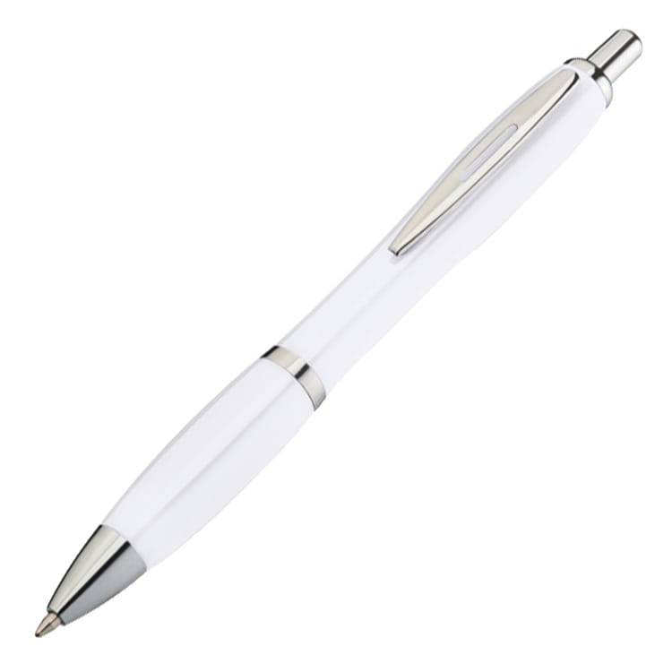 Plastikowy długopis z matowym uchwytem u dołu dla wygody w pisaniu. Wyposażony w niebieski wkład.