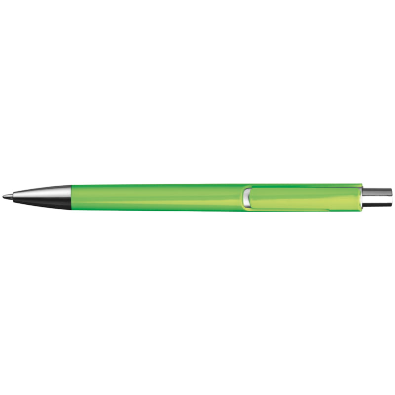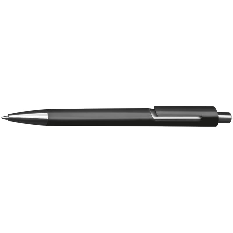 Plastikowy długopis z wkładem piszącym na niebiesko i srebrną aplikacją pod klipem.