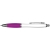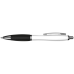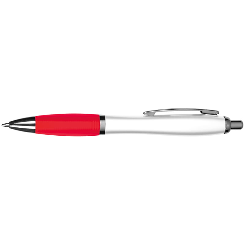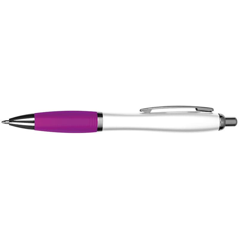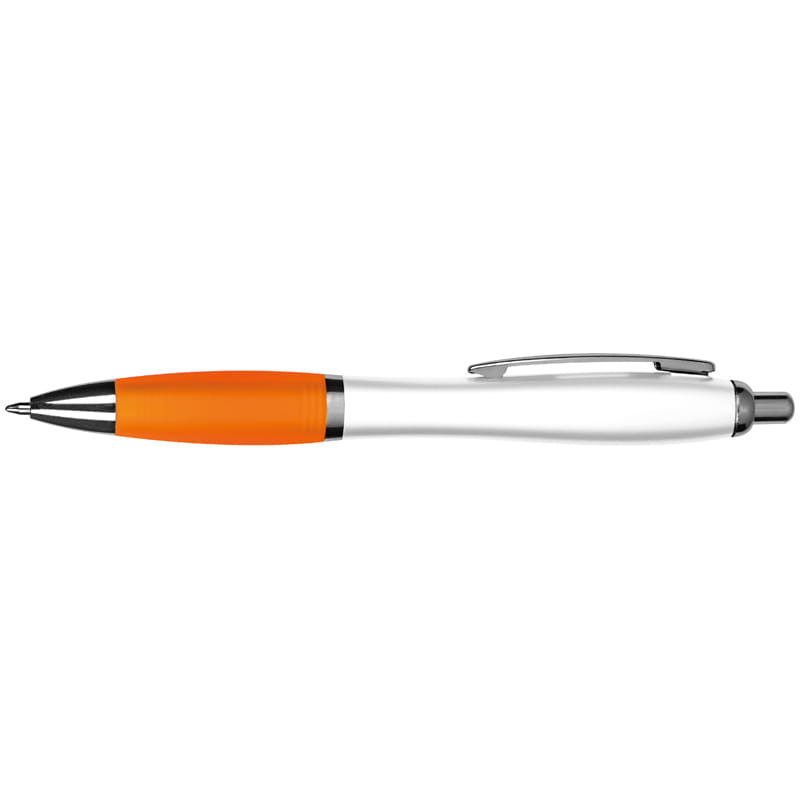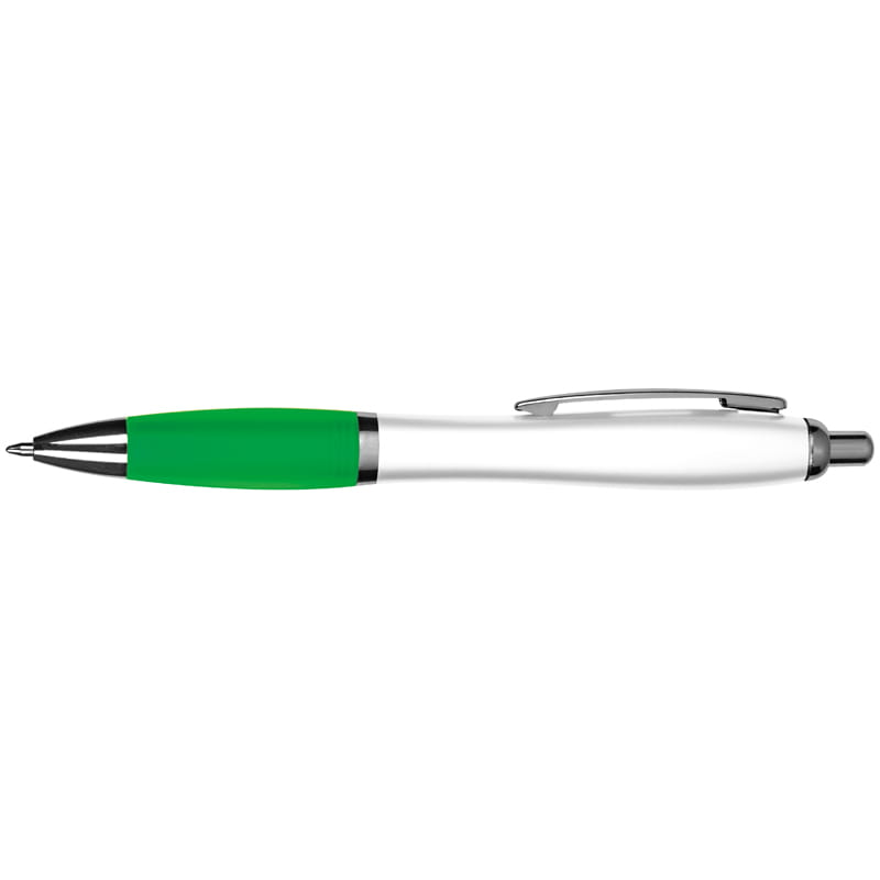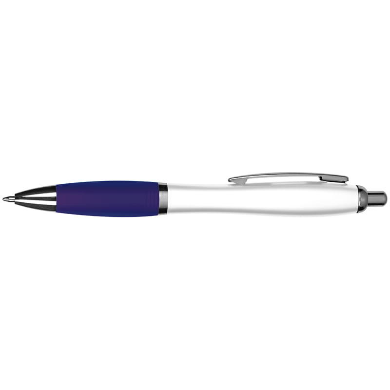 Długopis plastikowy z białym korpusem i kolorową gumką ułatwiającą trzymanie. Wyposażony w metalowy klips i duży wkład piszący na niebiesko. Logotyp można umieścić pod klipsem.