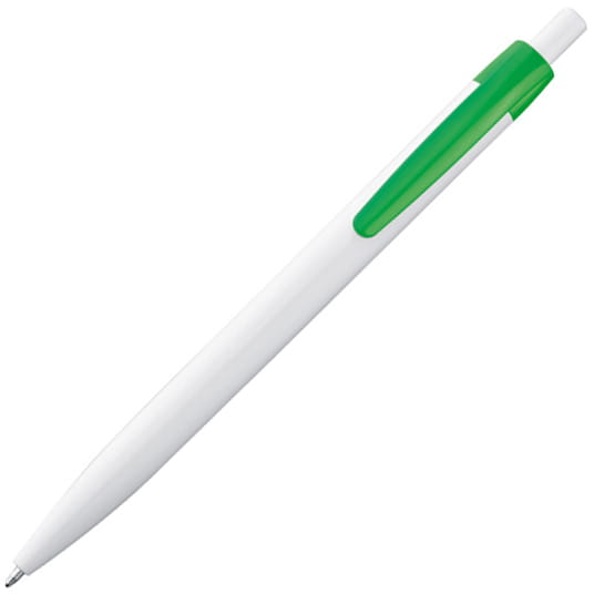 Plastikowy długopis o klasycznym, opływowym kształcie z niebieskim wkładem. Dzięki białemu korpusowi kolorowy klip sprawia, że długopis rzuca się w oczy. Logotyp proponujemy umieścić na korpusie.