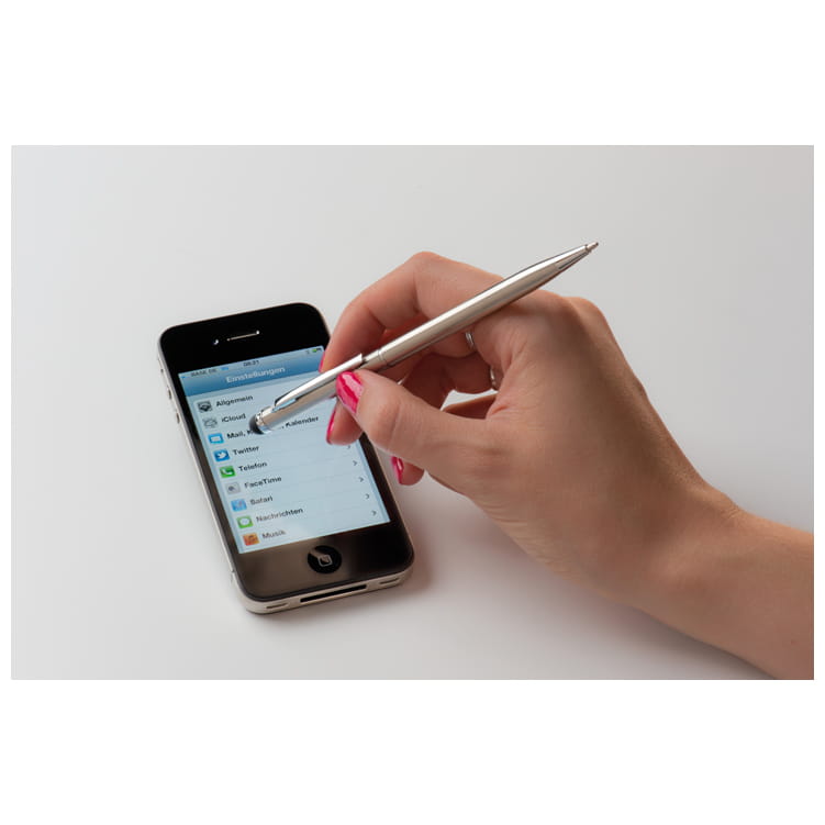 Długopis wykonany ze stali nierdzewnej z praktyczną końcówką do obsługi ekranów dotykowych. Długopis posiada niebieski wkład.