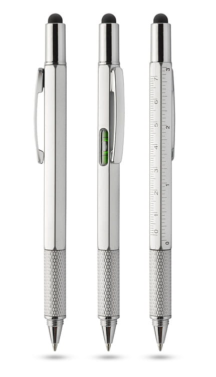 Wielozadaniowy długopis dla każdego fana majsterkowania. Gadżet wyposażony jest w dwie miarki (centymetry i cale) umieszczone na korpusie oraz małą poziomicę. Natomiast pod nakrętką z touch penem znajduje się dwustronny śrubokręt mocowany za pomocą magnesu - poręczny i wygodny w użyciu. Znakowanie możliwe na korpusie.