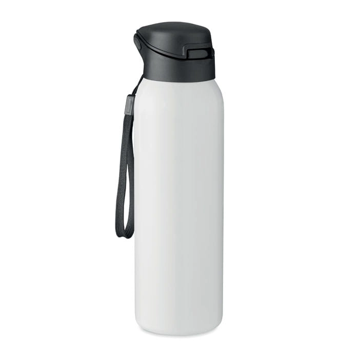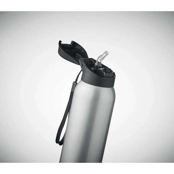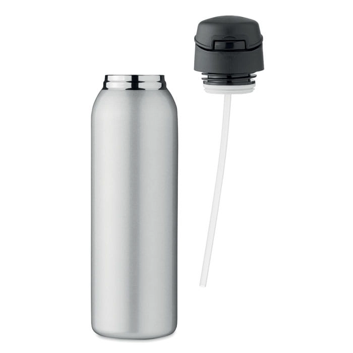 Dwuścienna butelka ze stali nierdzewnej, izolowana próżniowo, ze zintegrowaną słomką lub ustnikiem i z zakrętką z zawieszką. Pojemność 580 ml.
