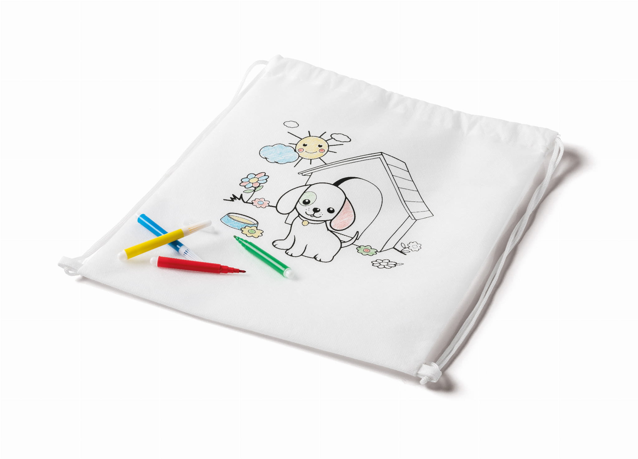 Dziecięcy worek do kolorowania. Non-woven: 80 g/m². Posiada rysunek do kolorowania oraz wewnętrzną kieszeń. 4 flamastry w zestawie.