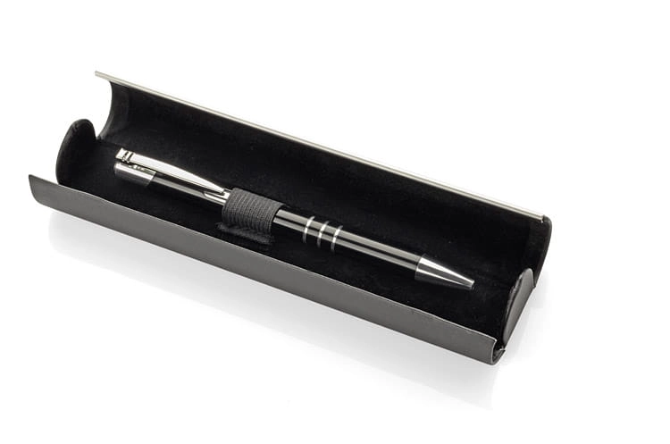 Doskonały pomysł na zapakowanie dowolnego artykułu piśmienniczego. Niezwykle eleganckie, zamykane na magnesy etui z czarnej ekoskórki zachwyca wykonaniem oraz funkcjonalnością. Wnętrze wyłożone welurem posiada gumkę do mocowania jednego artykułu piśmienniczego. Zamknięcie ozdobione metalową blaszką, na której możliwe jest wykonanie znakowania. Pasuje do wszystkich modeli długopisów.