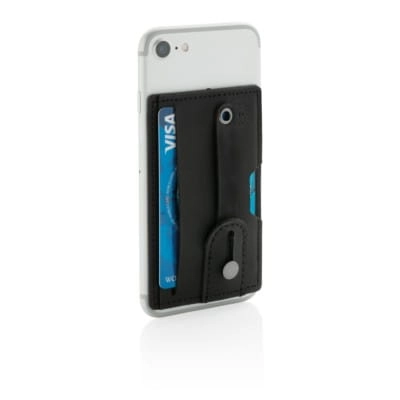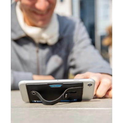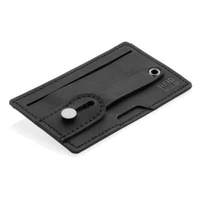 Etui na karty kredytowe 3 w 1, stojak na telefon, uchwyt do telefonu, ochrona RFID, mieści do 2 kart, wykonane z PU, posiada taśmę umożliwiającą przyczepienie do płaskiej powierzchni telefonu, po wysunięciu paska działa jako uchwyt lub stojak na telefon