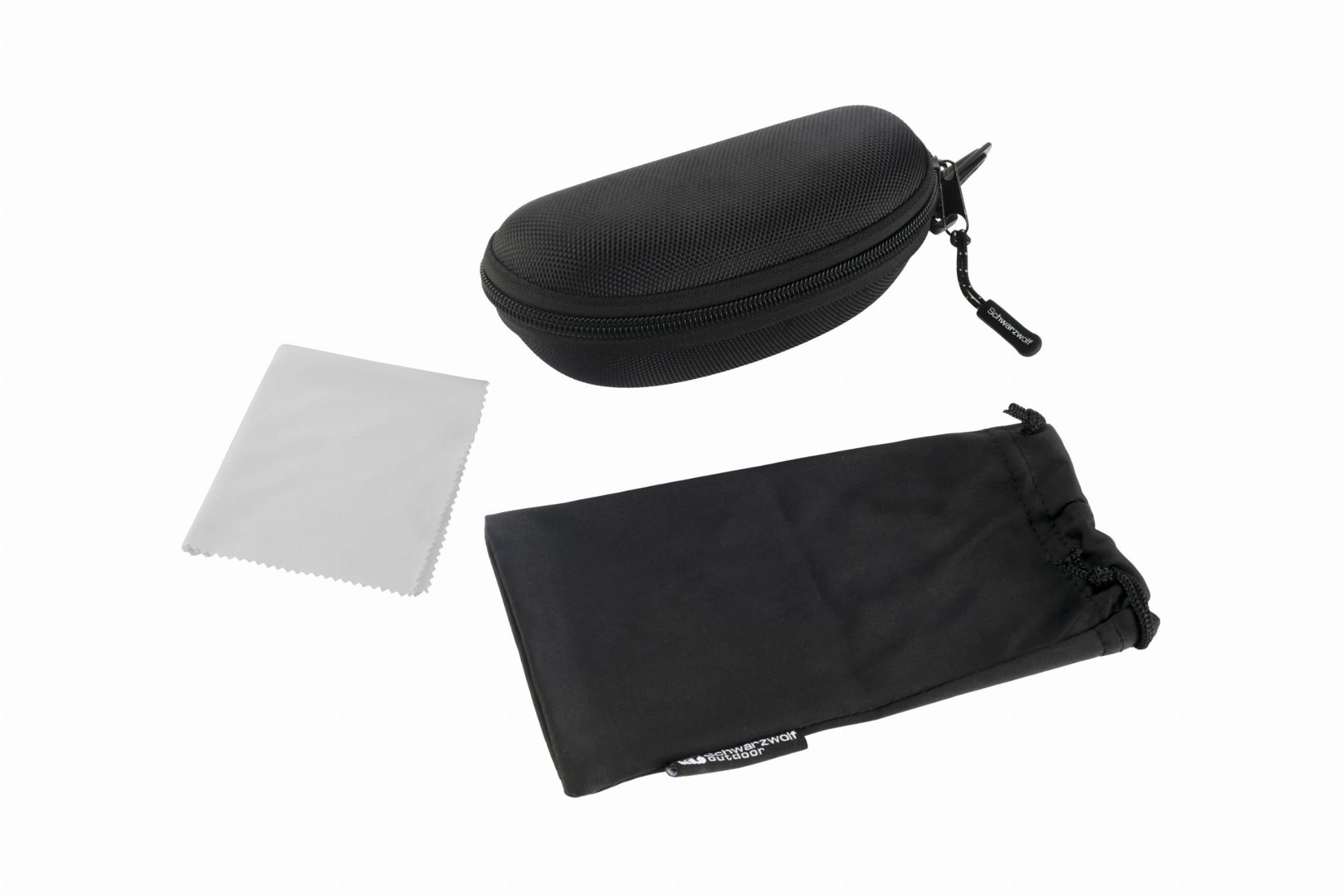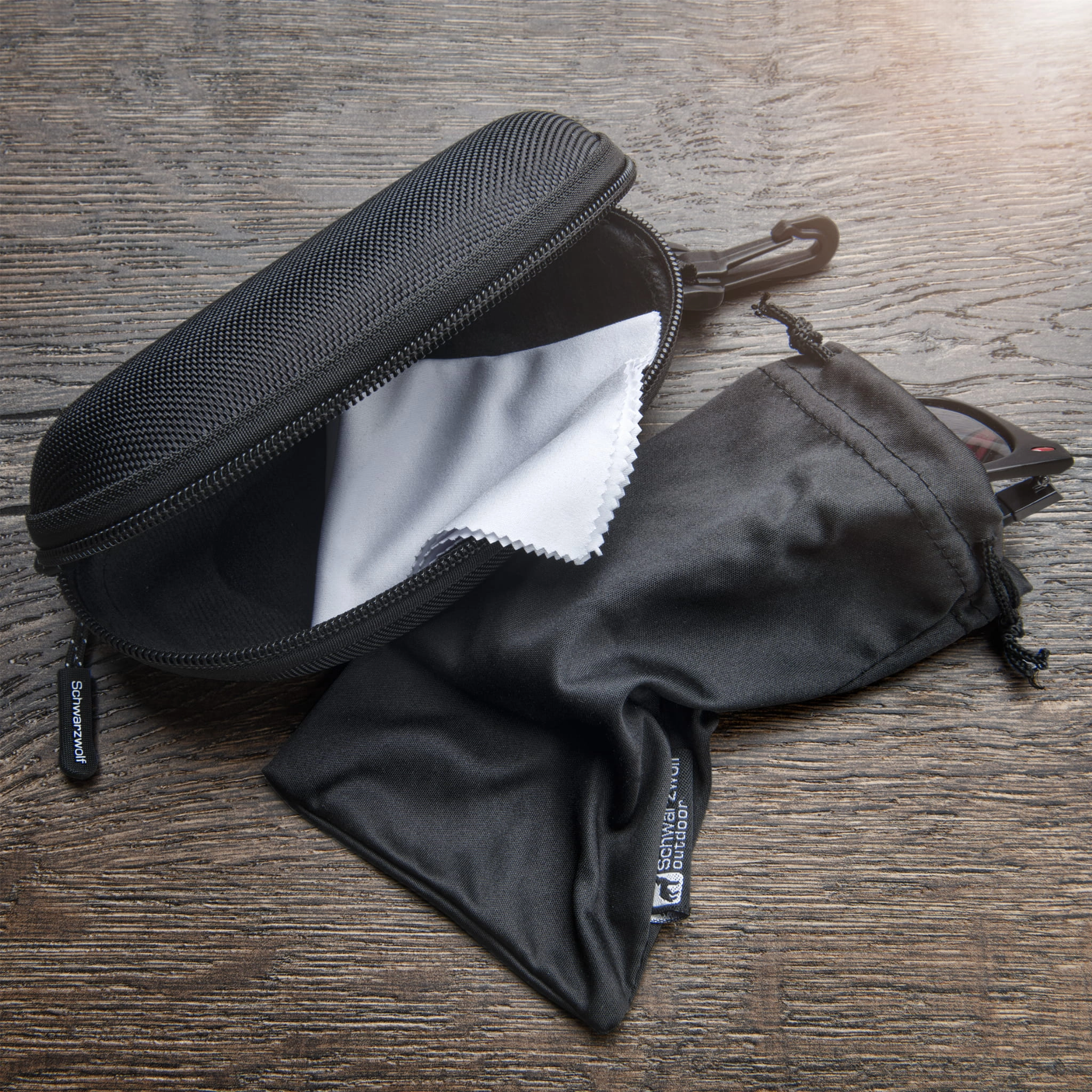 Twarde etui Schwarzwolf na okulary przeciwsłoneczne. Etui jest wykonane z płótna i aksamitu, w kolorze czarnym. Posiada zamek oraz logo Schwarzwolf na suwaku zamka. W zestawie dołączony jest czarny woreczek z mikrofibry oraz biała ściereczka z mikrofibry.