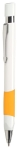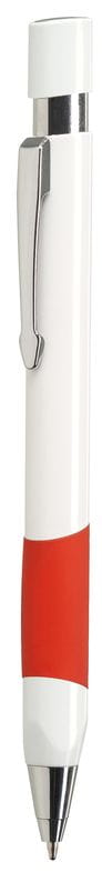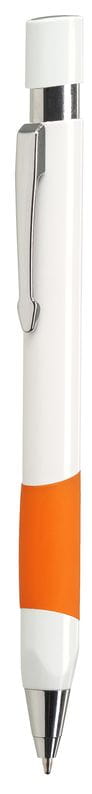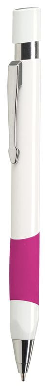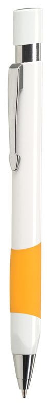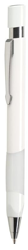 Biały korpus, srebrny metalowy klip, chromowany pierścień, wierzchołek i końcówka, kolorowa gumka, trójkątny przekrój.