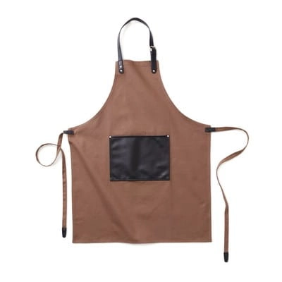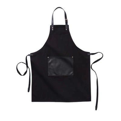 Fartuch kuchenny, wykonany z bawełny, detale ze skóry wegańskiej, kieszeń z przodu, regulowany pasek
