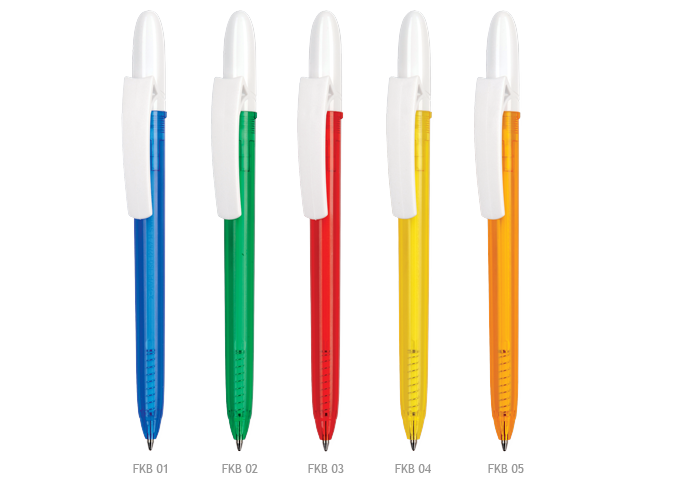 Długopis z mechanizmem obrotowym, biały pełny klip i kolorowy transparentny korpus.