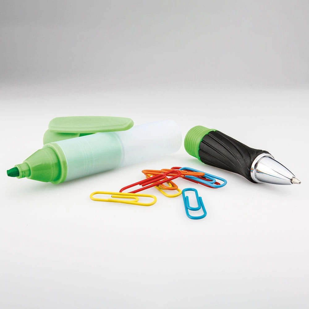 Długopis 3 w 1,piszący na niebiesko, z markerem i przegródką z 8 kolorowymi spinaczami biurowymi.
