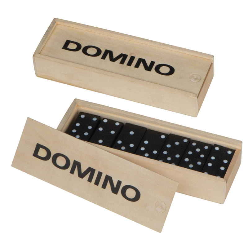 Popularna gra domino wykonana z drewna umieszczona w drewnianym pudełku, na którym można umieścić logotyp.