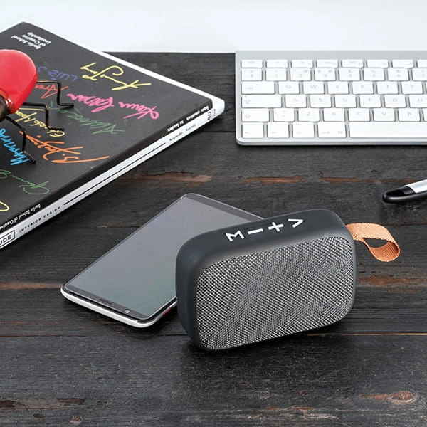Głośnik z mikrofonem. ABS i tkanina poliestrowa. Gumowe wykończenie. Transmisja danych bluetooth, wejście stereo 3,5 mm i czytnik kart typu TF. Moc 3W/4Ω. Czas pracy baterii do 2 godzin. Funkcja odbierania połaczeń, regulacji głośności, czytania list utwo