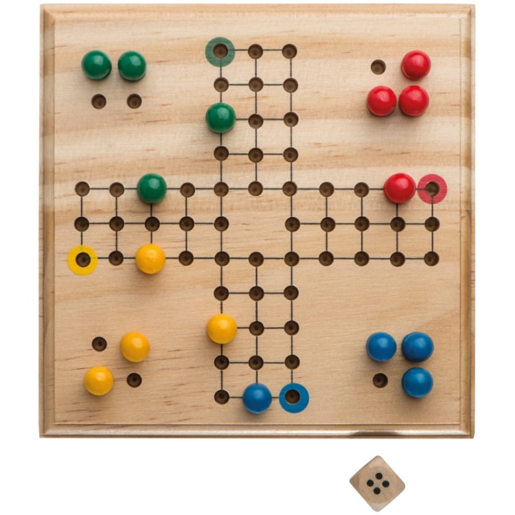 Klasyczna plansza do gry w chińczyka wykonana z drewna. Pionki można zaczepiać o planszę, co ułatwia grę podczas podróży.