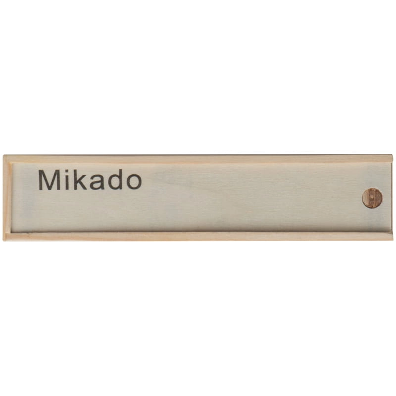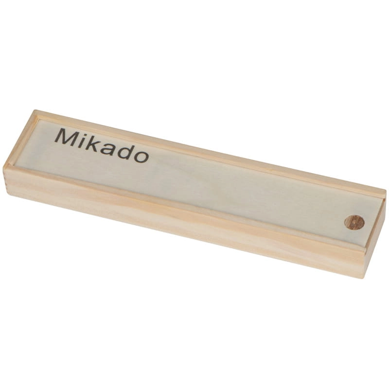 Popularna gra mikado wykonana z drewna umieszczona w drewnianym pudełku, na którym można umieścić logotyp.