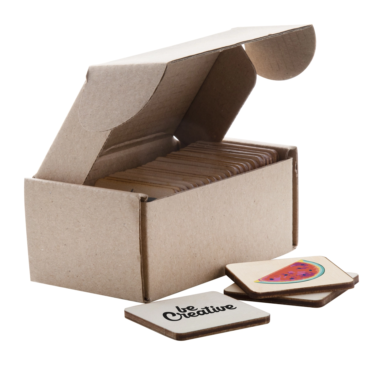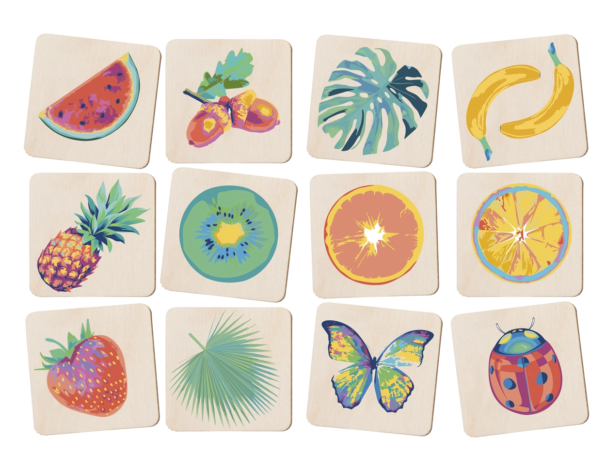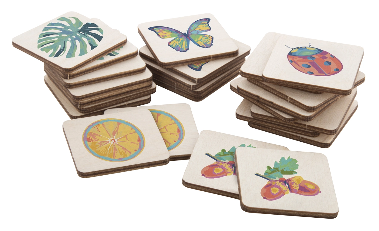 Gra memory z laminowanego drewna brzozowego z dowolnymi grafikami. 24 elementy (40x40 mm). Cena zawiera 12 różnych, full kolorowych nadruków na przedniej stronie i 1 kolorowy nadruk logo z tyłu. Min. ilość: 250szt.