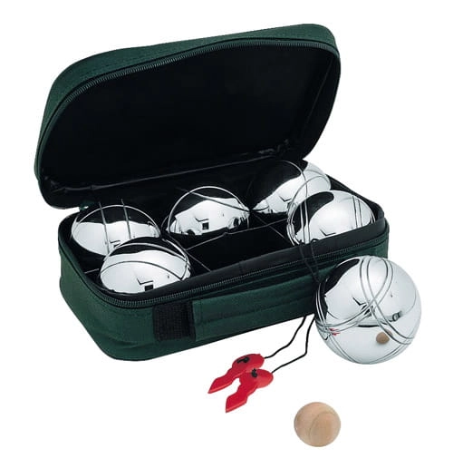 Gra w bule dla 3 osób, zawiera komplet sześciu metalowych kul, małą drewnianą kulkę oraz taśmę do mierzenia odległości. Gra umieszczona w nylonowym etui.
