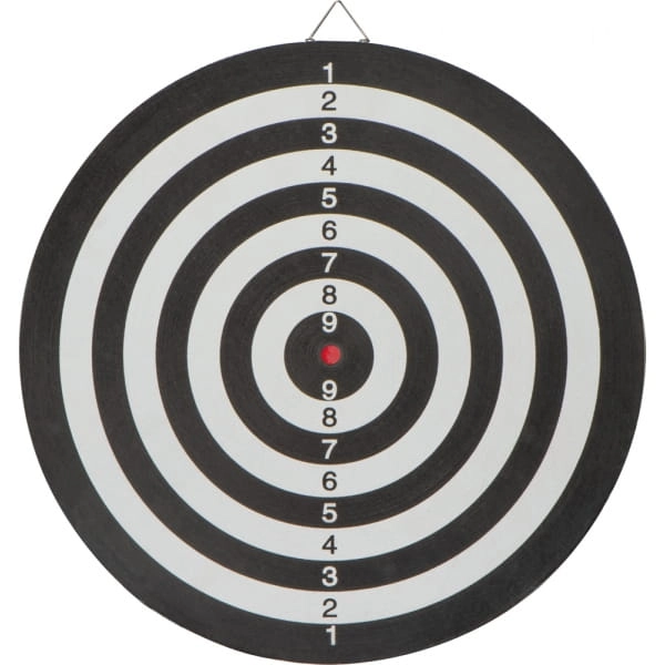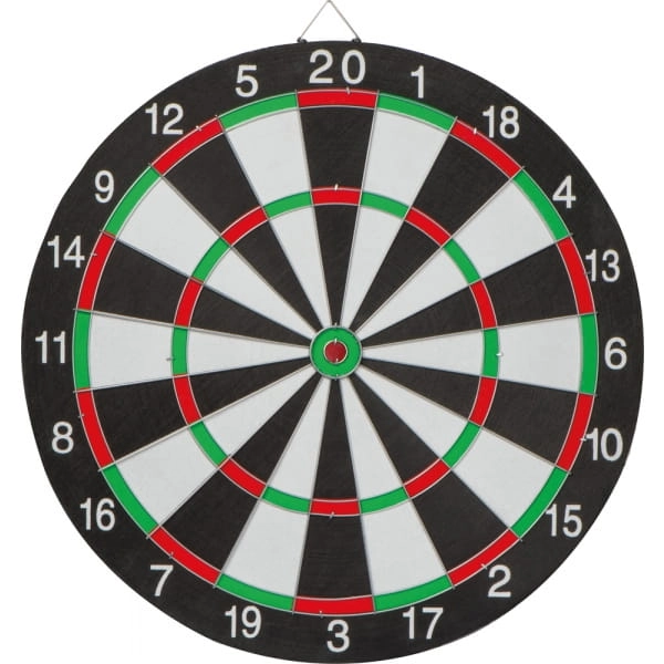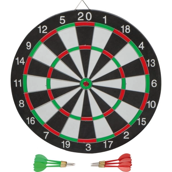 Gra w rzutki z 6 rzutkami (3 zielone, 3 czerwone). Dwustronna tarcza posiada metalową pętelkę do mocowanie na ścianie.