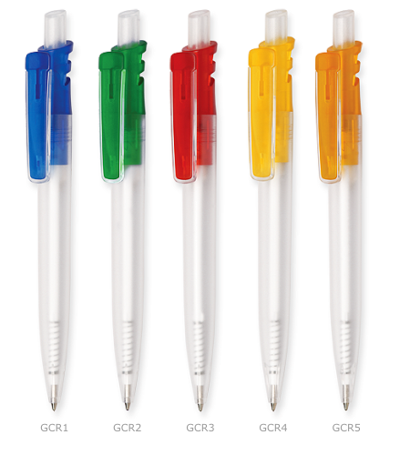 Kolorowy przeźroczysty klip, biała przeźroczysta nakładka, przycisk i korpus.