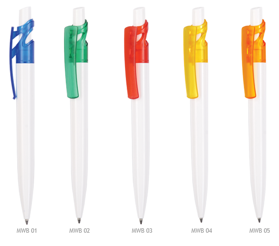 Kolorowy transparentny klip, biały pełny korpus, nakładka i przycisk.