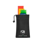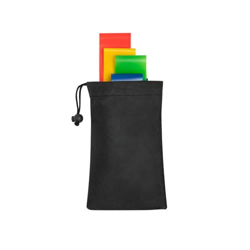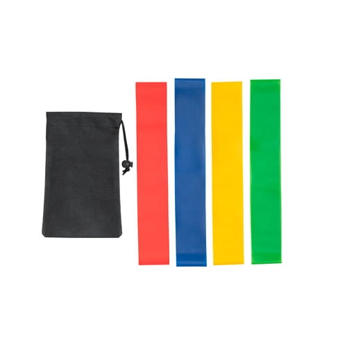 Zestaw 4 taśm fitness dostarczany w czarnym etui non-woven. Różne poziomy oporu: Czerwona -wysoki, Żółta - średni, Niebieska - niski, Zielona - bardzo niski