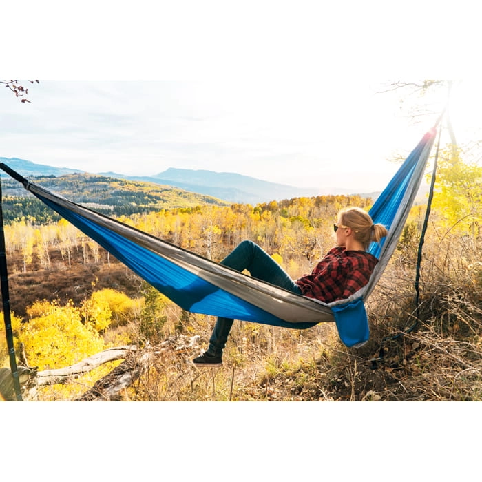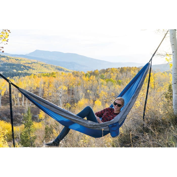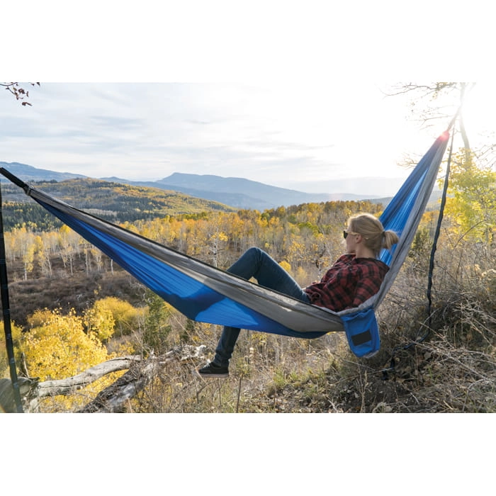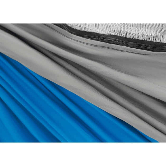 Hamak ze zintegrowaną moskitierą. Wykonany z lekkiego i wytrzymałego nylonu. Dla łatwego montażu pasek i karabińczyki są w komplecie. Obciążenie do 200 kg.