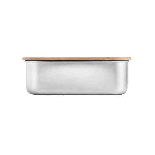Pudełko na lunch ze stali nierdzewnej z bambusową pokrywką i elastyczną taśmą do bezpiecznego przenoszenia. Pojemność do 800 mL. Dostarczany w pudełku kraft