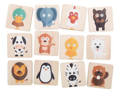 Laminowana gra pamięciowa z drewna brzozowego z postaciami zwierząt. Z 24 płytkami (40 x 40 mm). Cena obejmuje 1 kolorowy nadruk logo na tylnej stronie wszystkich płytek. Minimalne zamówienie: 50 sztuk.