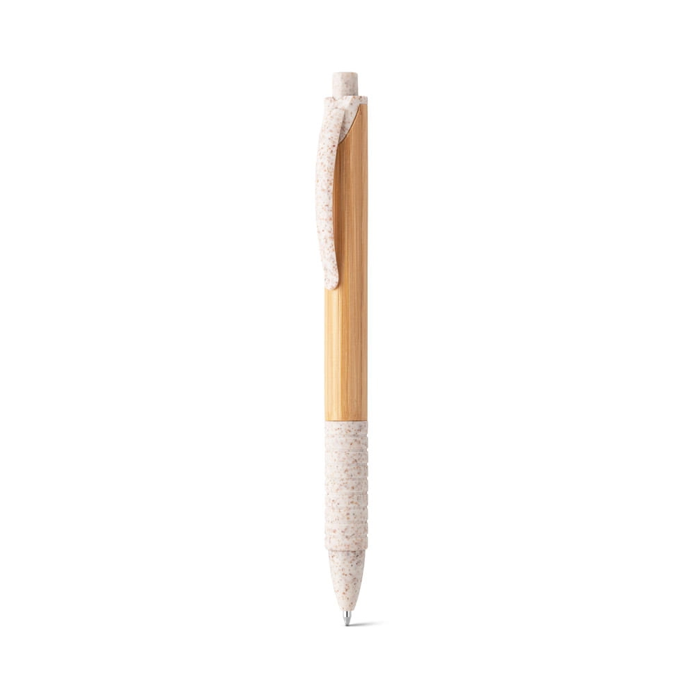 Bambusowy długopis z antypoślizgowym uchwytem, klipsem i kolorowymi elementami z włókna pszenicznego i ABS. Niebieski tusz