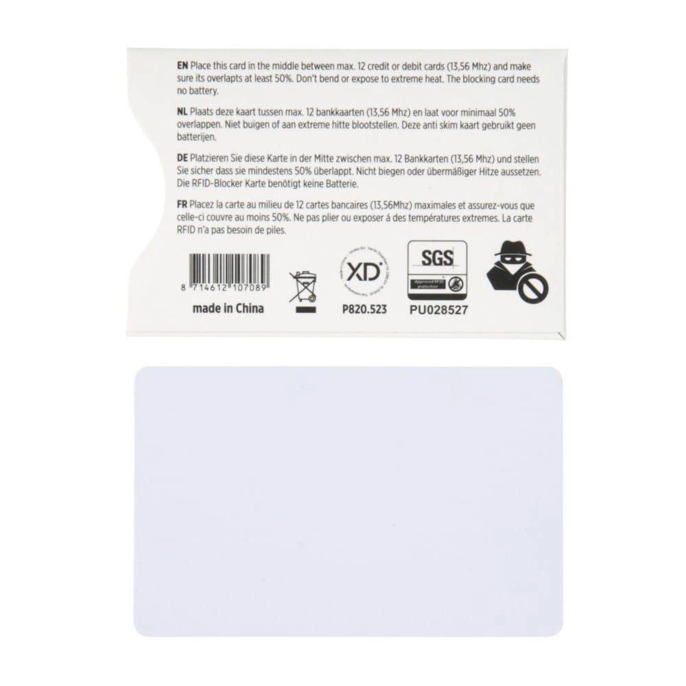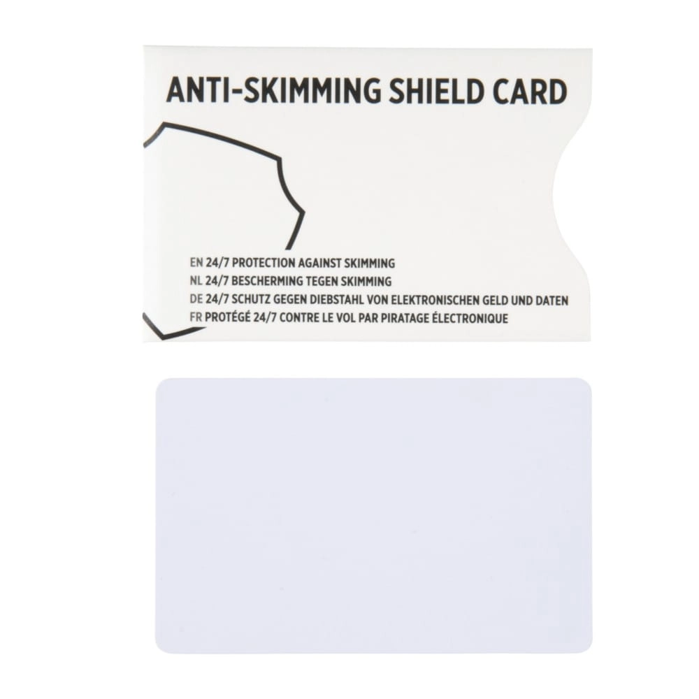 Karta do portfela z ochroną RFID, pobiera energię ze skanerów NFC/RFID do wytworzenia pola elektronicznego, dzięki któremu wszystkie karty 13,56 MHz stają się niewidoczne dla skanerów, nie wymaga używania baterii, opatentowana technologia E-FIELD z ochroną 24/7 przed elektroniczną kradzieżą