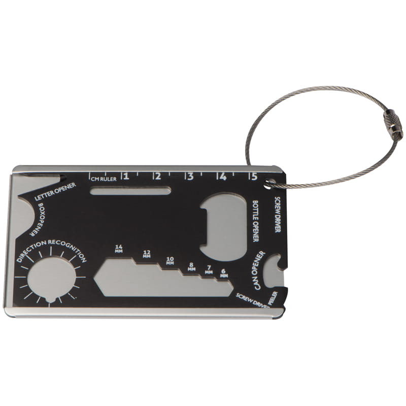 Karta survivalowa wykonana z aluminium. Zawiera: linijkę, otwieracz do butelek, śrubokręt, kompas, klucze i obieraczkę. Logotyp można umieścić bezpośrednio na produkcie.