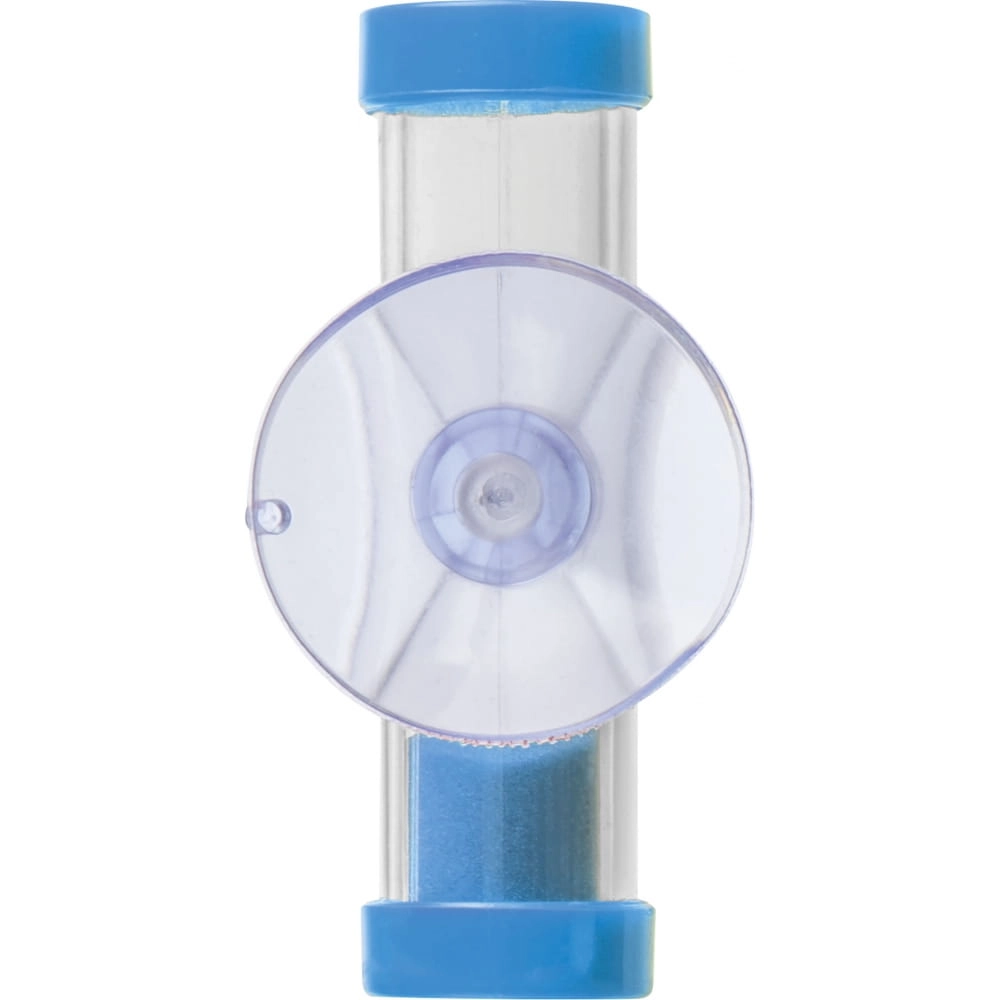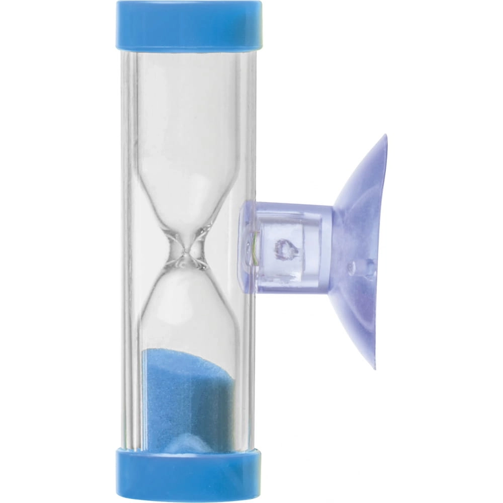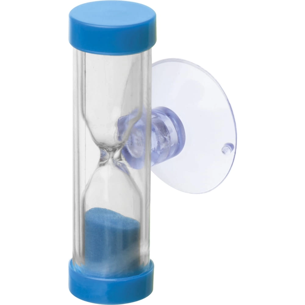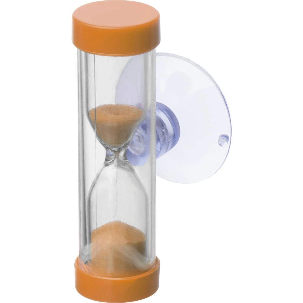 Mała klepsydra wypełniona kolorowym piaskiem, jedno przesypanie się piasku trwa 3 minuty.