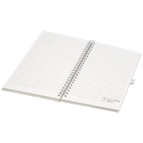 Kołozeszyt w formacie A5 z 70 kartkami w linie o gramaturze 80 g/m², wykonany z kartonów po mleku pochodzących z recyklingu (do 70%). Zużyte kartony po mleku są zbierane, sortowane, przetwarzane i zamieniane w papier, co pozwala na przekształcenie odpadów w coś użytecznego.