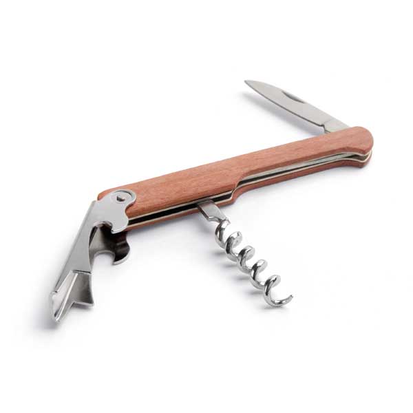 Korkociąg. Drewno. Zawiera otwieracz do butelek i nóż.