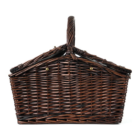 Koszyk piknikowy dla dwóch osób, zaopatrzony w plastikowe kieliszki, porcelanowe talerze, sztućce oraz nóż kelnerski. Dodatkowo torbę wyposażono w komorę chłodzącą.