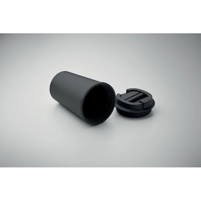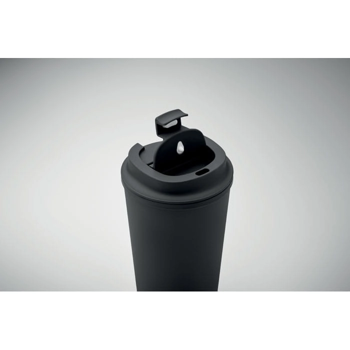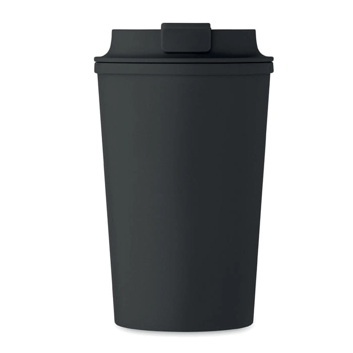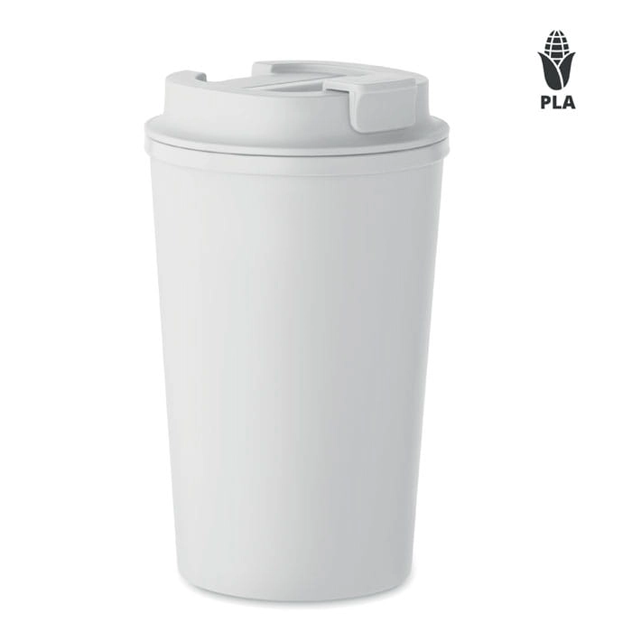 Kubek z podwójnymi ściankami z kukurydzy PLA z pokrywką do picia z recyklingowanego PP z wewnętrznym TPR. Pojemność: 350 ml.
