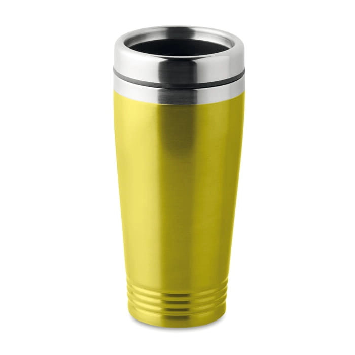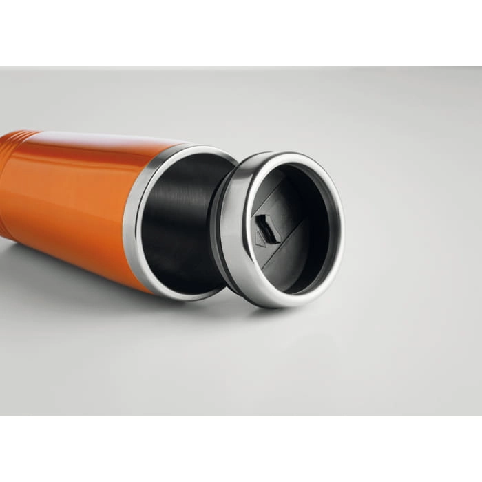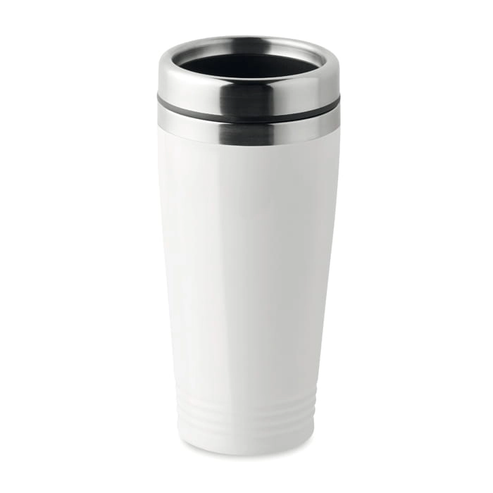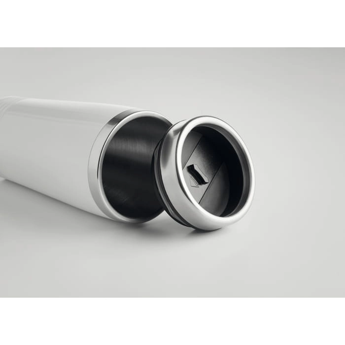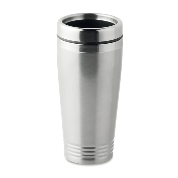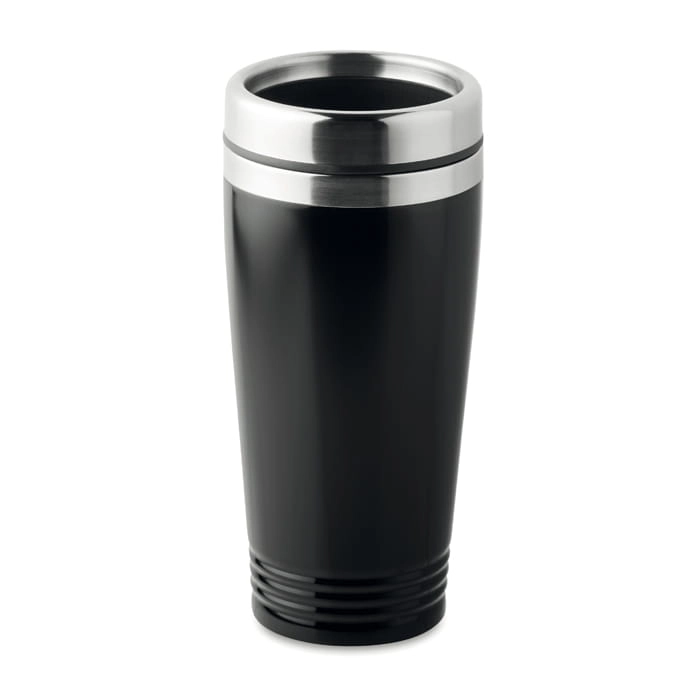 Podwójny kubek ze stali nierdzewnej z czarną pokrywką z PP. Pojemność: 400 ml.