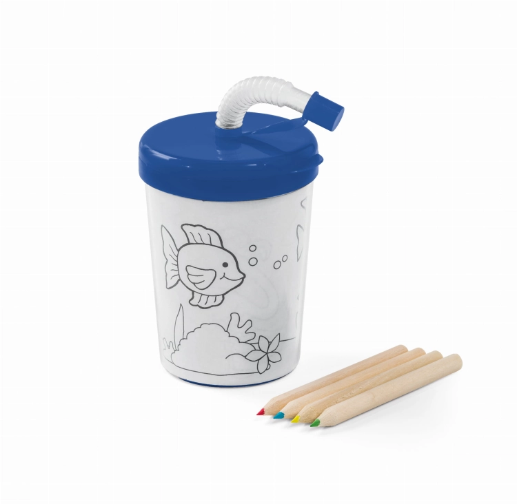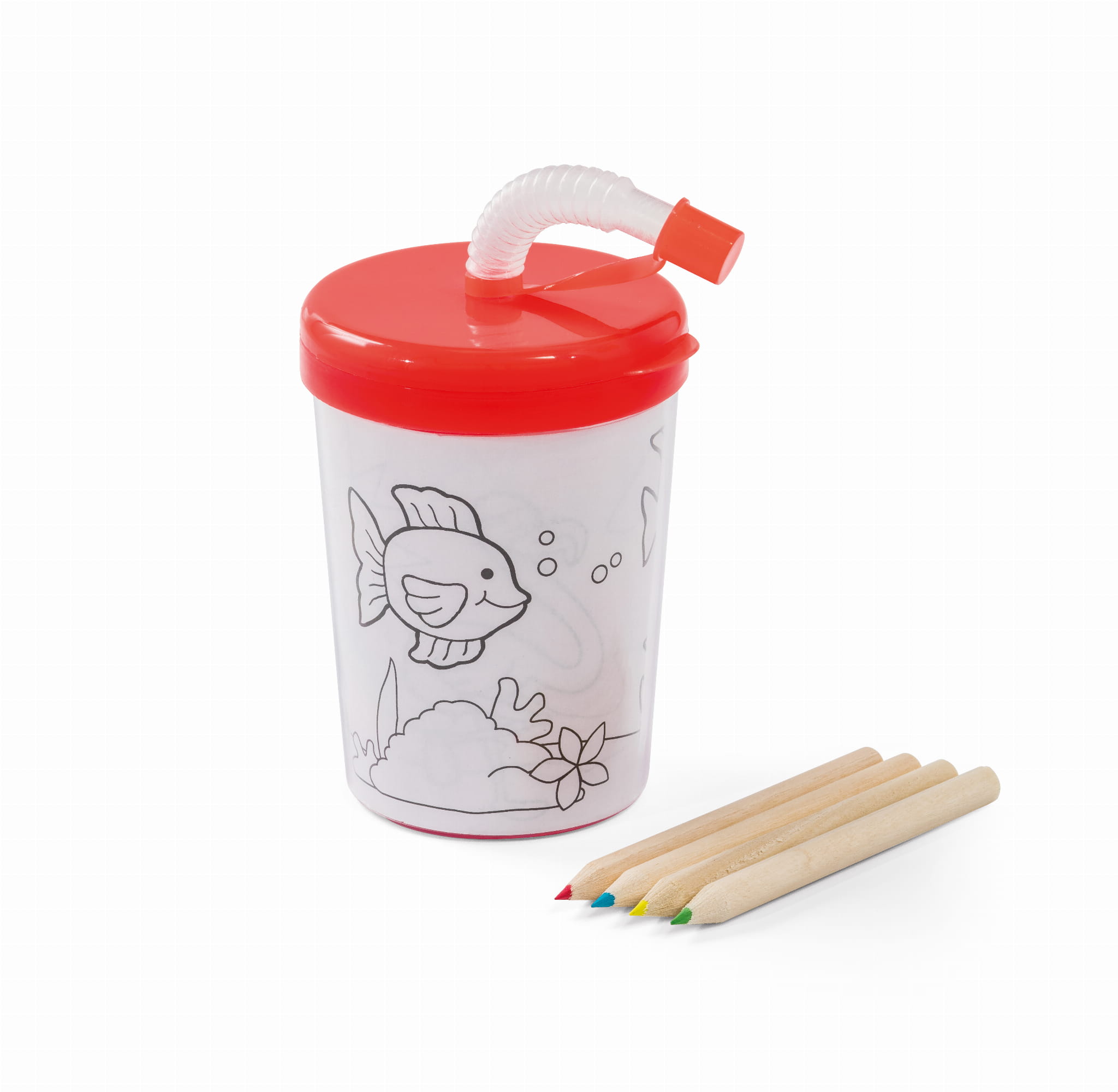 Kubek podróżny. PP i PS. Zawiera elastyczną słomkę. 3 rysunki do kolorowania (4 kredki dołączone). Pojemność do 200 ml. Dostarczany w prezentowym pudełku.