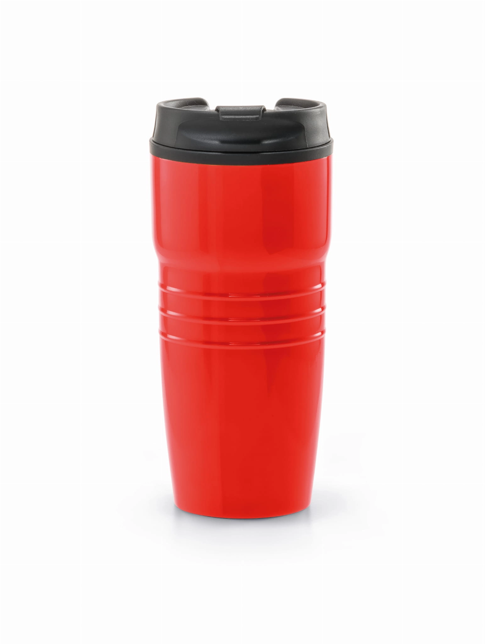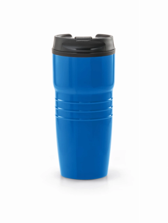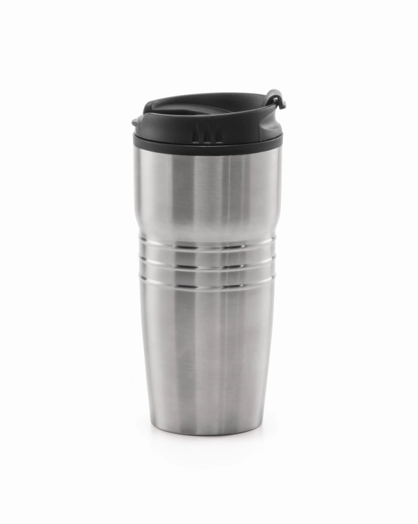 Kubek podróżny. Stal nierdzewna i polipropylen. Podwójne ścianki korpusu, wieczko i antypoślizgowa podstawa. Pojemność do 520 ml. Dostarczany w pudełku.