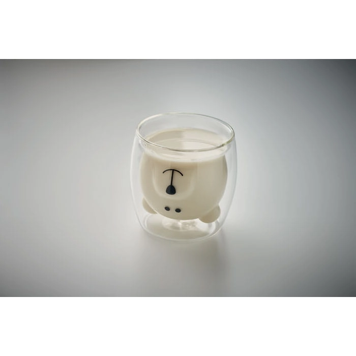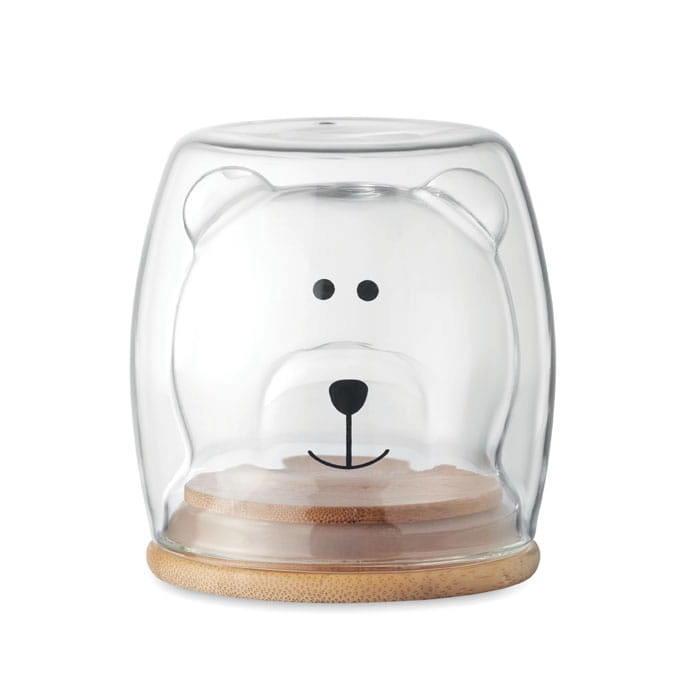 Kubek z borosilikatowego szkła o podwójnych ściankach, z motywem niedźwiedzia i z bambusową pokrywką. Pojemność: 260 ml.