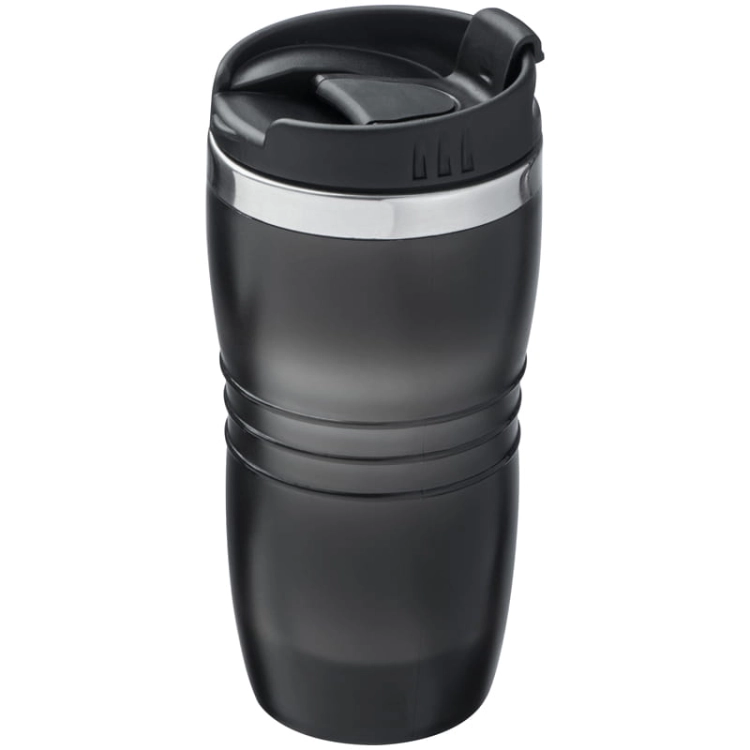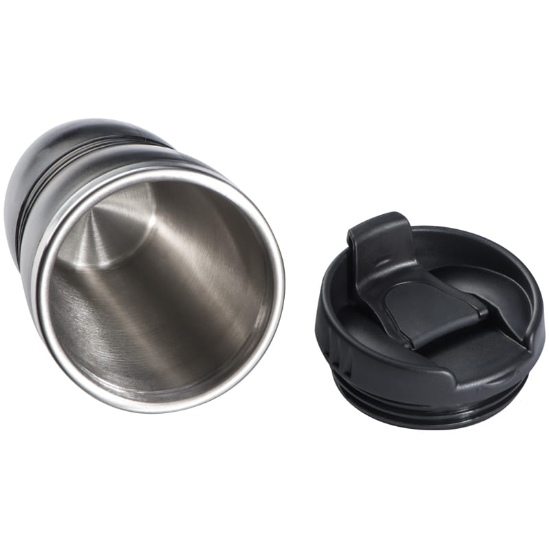 Kubek termiczny wykonany w środku ze stali nierdzewnej, a na zewnątrz z plastiku. Posiada szczelną pokrywkę oraz powłokę antypoślizgową. Pojemność 450 ml. Logotyp można umieścić na kubku metodą tampodruku, natomiast grawer jest możliwy tylko na metalowej opasce kubka.