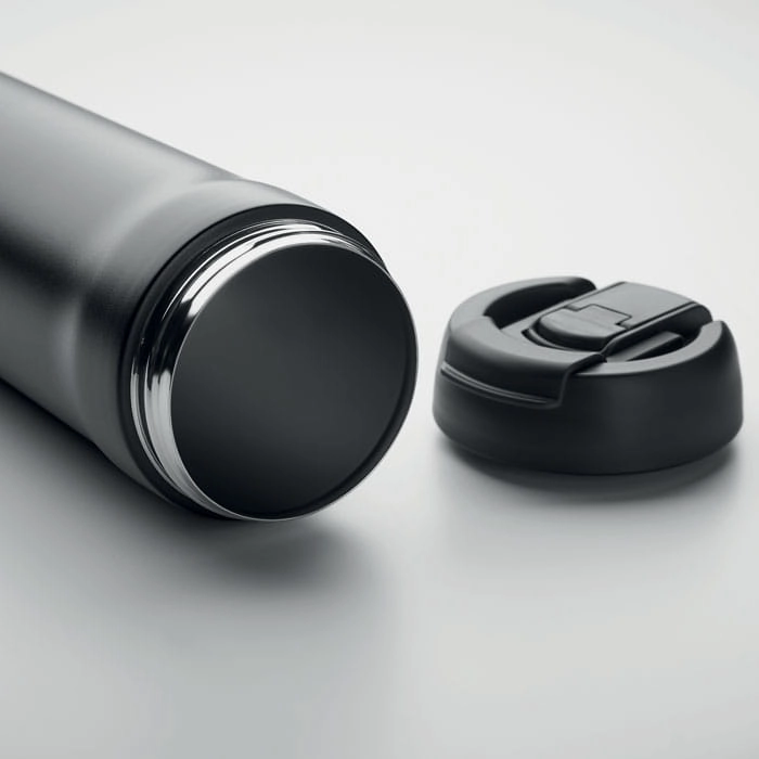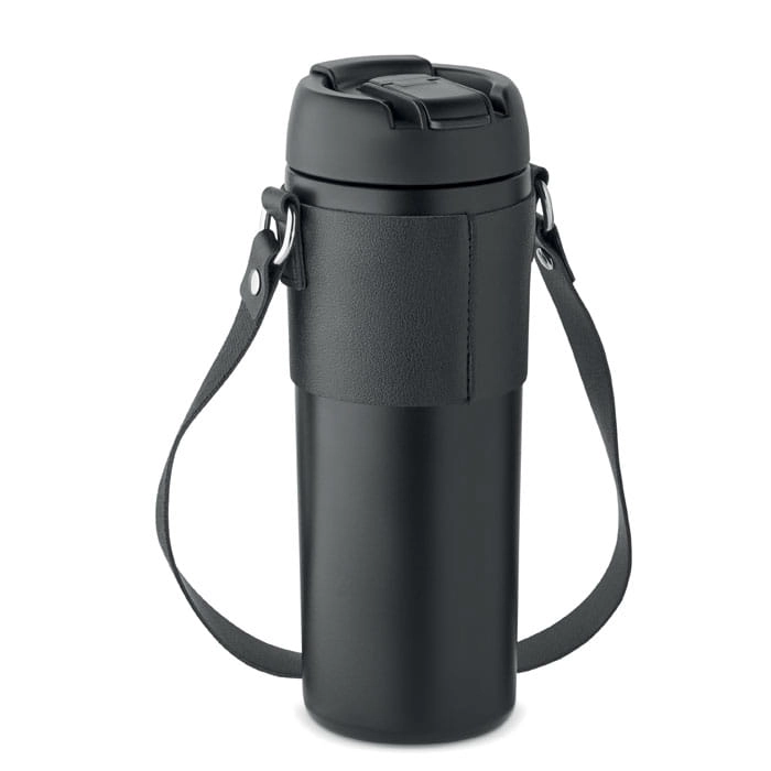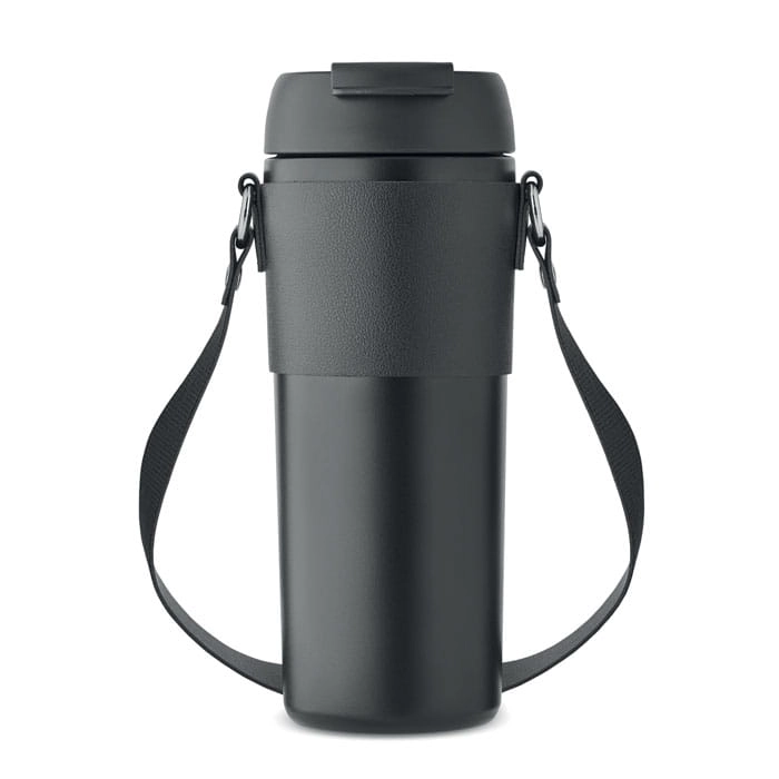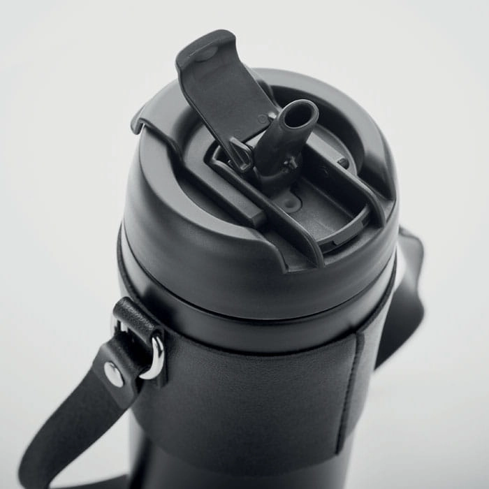Dwuścienny, malowany proszkowo kubek ze stali nierdzewnej z pokrywką z PP 2 w 1 i paskiem z PU. Szczelny. Pojemność: 700 ml.