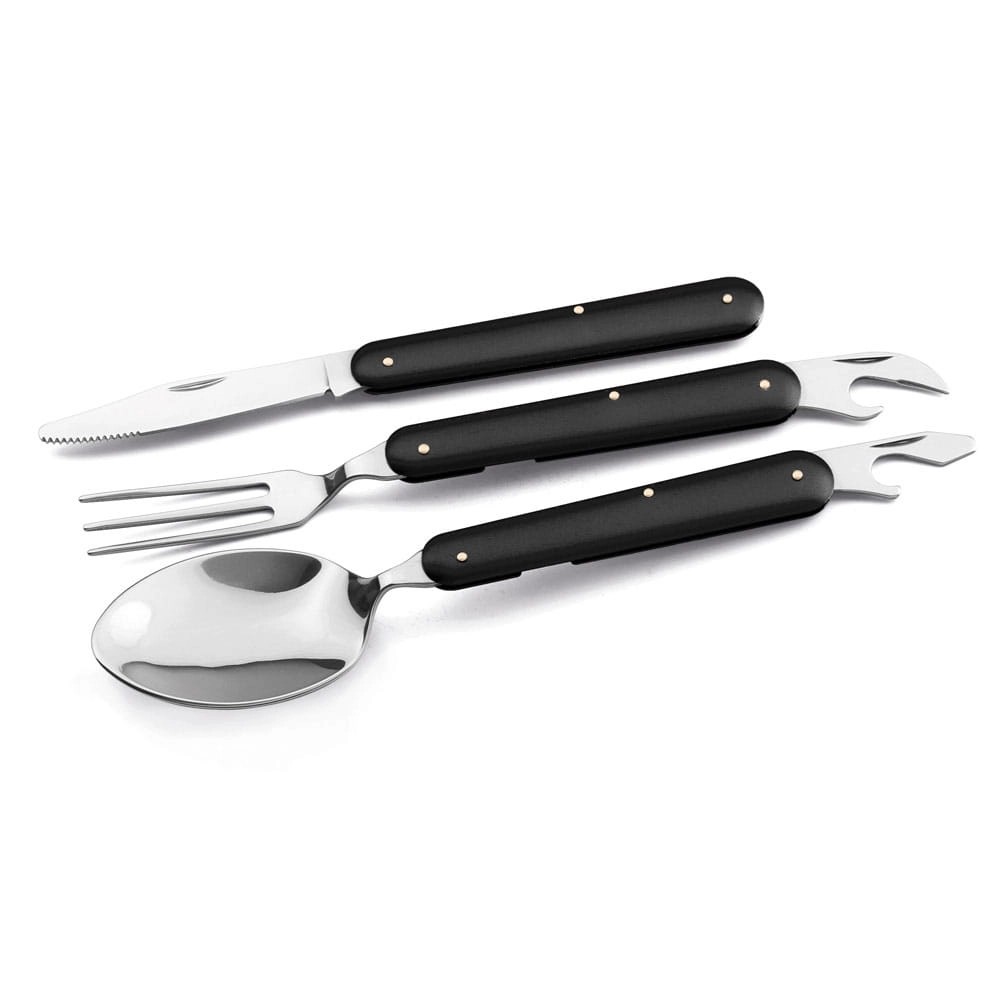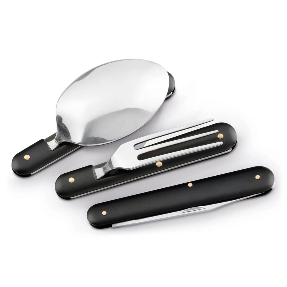Zestaw trzyczęściowy, składany: łyżka, widelec i nóż ze stali nierdzewnej. Dostarczany w tekstylnym pokrowcu 600D.