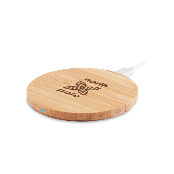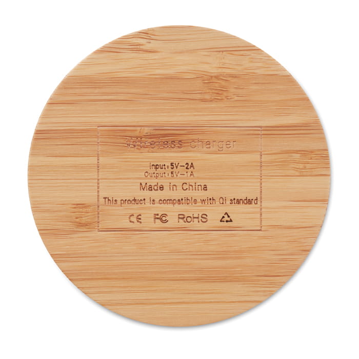 Okrągła ładowarka bezprzewodowa z bambusa. Aby naładować podłącz urządzenie do komputera i połóż telefon na powierzchni. Podczas ładowania świeci się niebieska lampka. Wyjście: DC5V/1.0A. Kompatybilna z urządzeniami obsługującymi QI, np. z najnowszym systemem android lub iPhone® 8, 8S oraz X i nowsze.