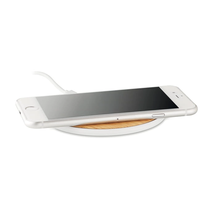Bezprzewodowa ładowarka z ABS z imitacją bambusa. Podłącz urządzenie do komputera, połóż na nim smartfon i ładuj. Wyjście: DC5V / 1,0A. Kompatybilna z systemami Android, iPhone® 8, X i nowszymi.
