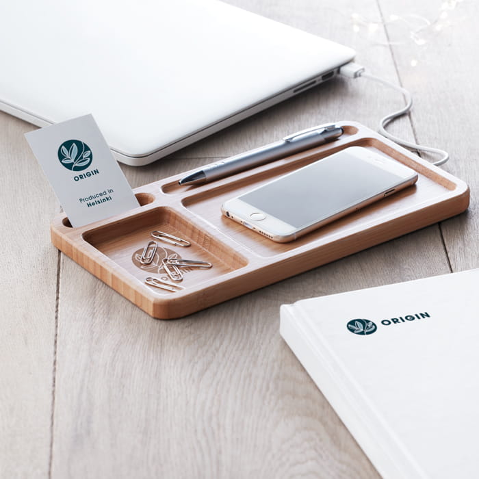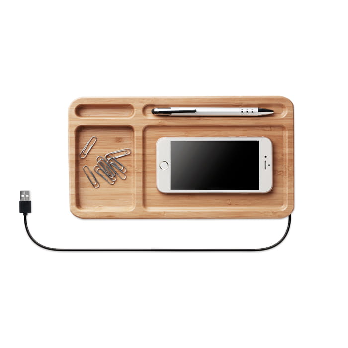 Organizer na biurko z bezprzewodową ładowarką. W zestawie kabel USB o długości 80 cm. Wyjście DC 5V / 1A. Kompatybilny ze wszystkimi urządzeniami z obsługą QI, takimi jak najnowsze Androidy, iPhone® 8, 8S i X oraz nowsze.