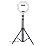Lampa pierścieniowa LED 26 cm z podstawką na statyw i uchwytem na telefon. Idealna do tik-tok®, live-streamingu, transmisji i fotografii. W komplecie z przewodową migawką. Białe, ciepłe, światło (120 LED) z 10 poziomami jasności.