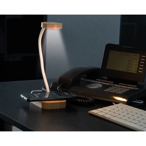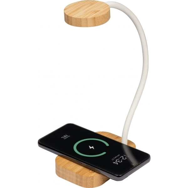 Lampa z bambusa z wbudowaną ładowarką indukcyjną i trze trybami świecenia - ciepłe, zimne oraz przyciemnione ciepłe światło.