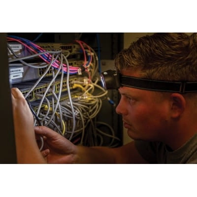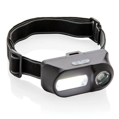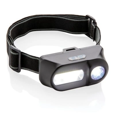 Latarka na głowę z 2 światłami, światło COB 180 lumenów do oświetlania przedmiotów w pobliżu, światło LED 90 lumenów o zasięgu świecenia do 80m, 3 tryby świecenia (jasny, przyciemniony, migający), wykonana z ABS, czas świecenia do 3 godzin, elastyczny, regulowany pasek, baterie w komplecie