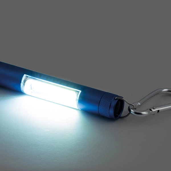 Latarka. Aluminium. Światło LED COB, otwieracz do butelek, haczyk do zawieszenia oraz magnes. Zawiera 5 baterii LR44.